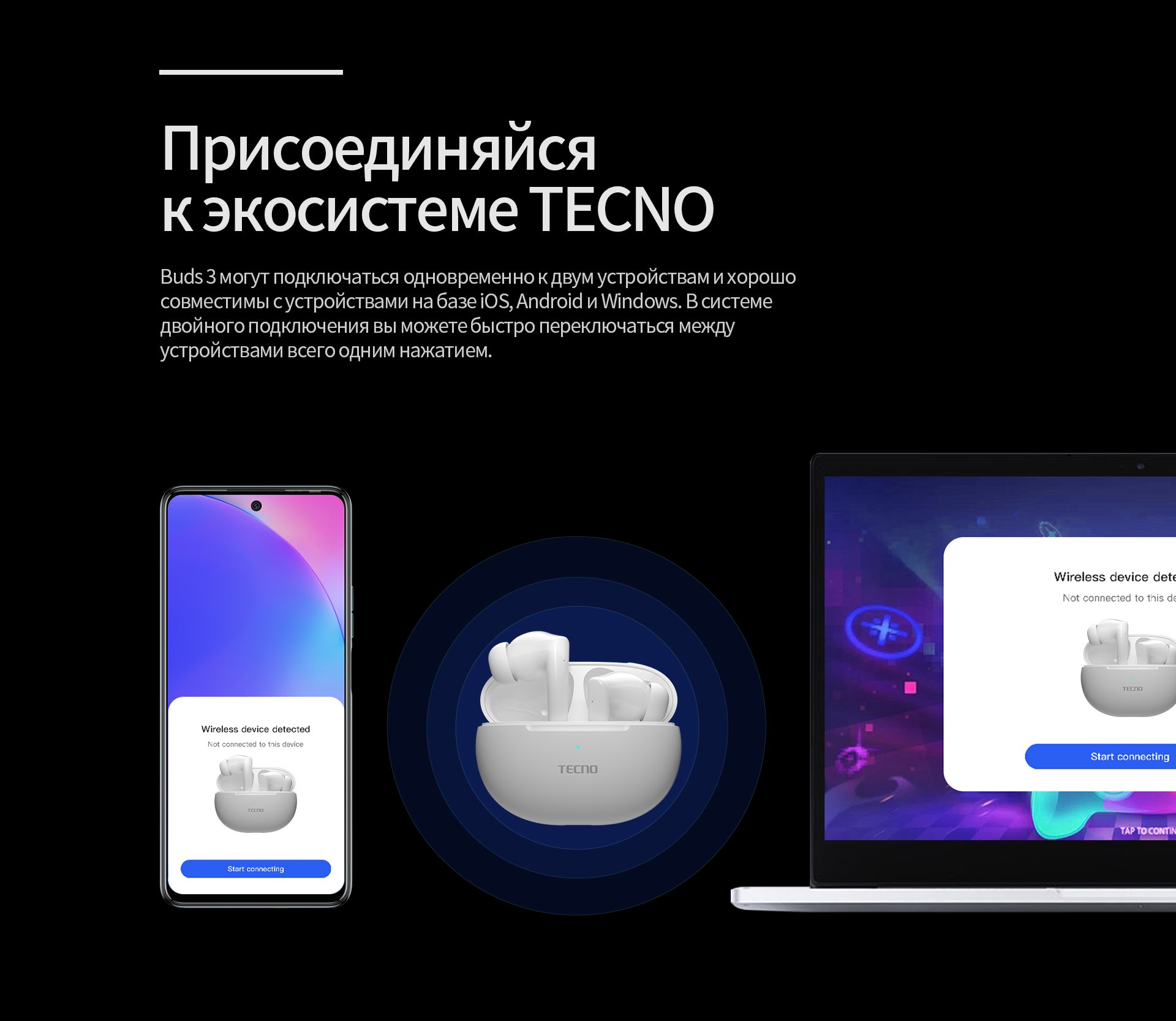 | Особенности, дополнительно | время воспроизведения аудио с учетом зарядного кейса до 35 ч, LED-индикатор состояния, возможность одновременного использования двумя устройствами |